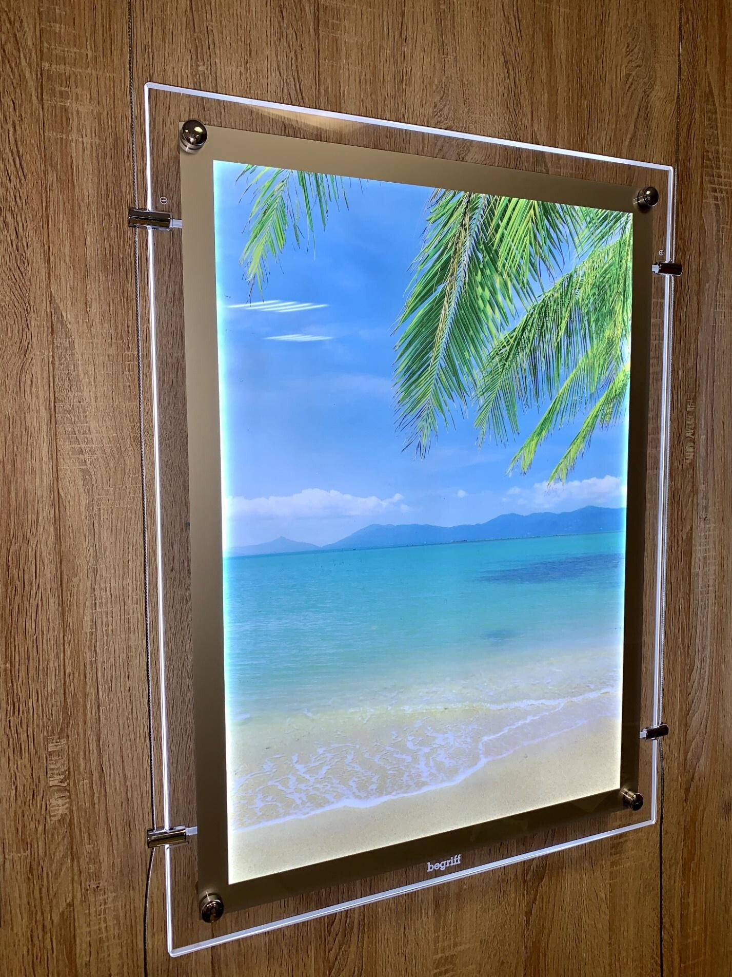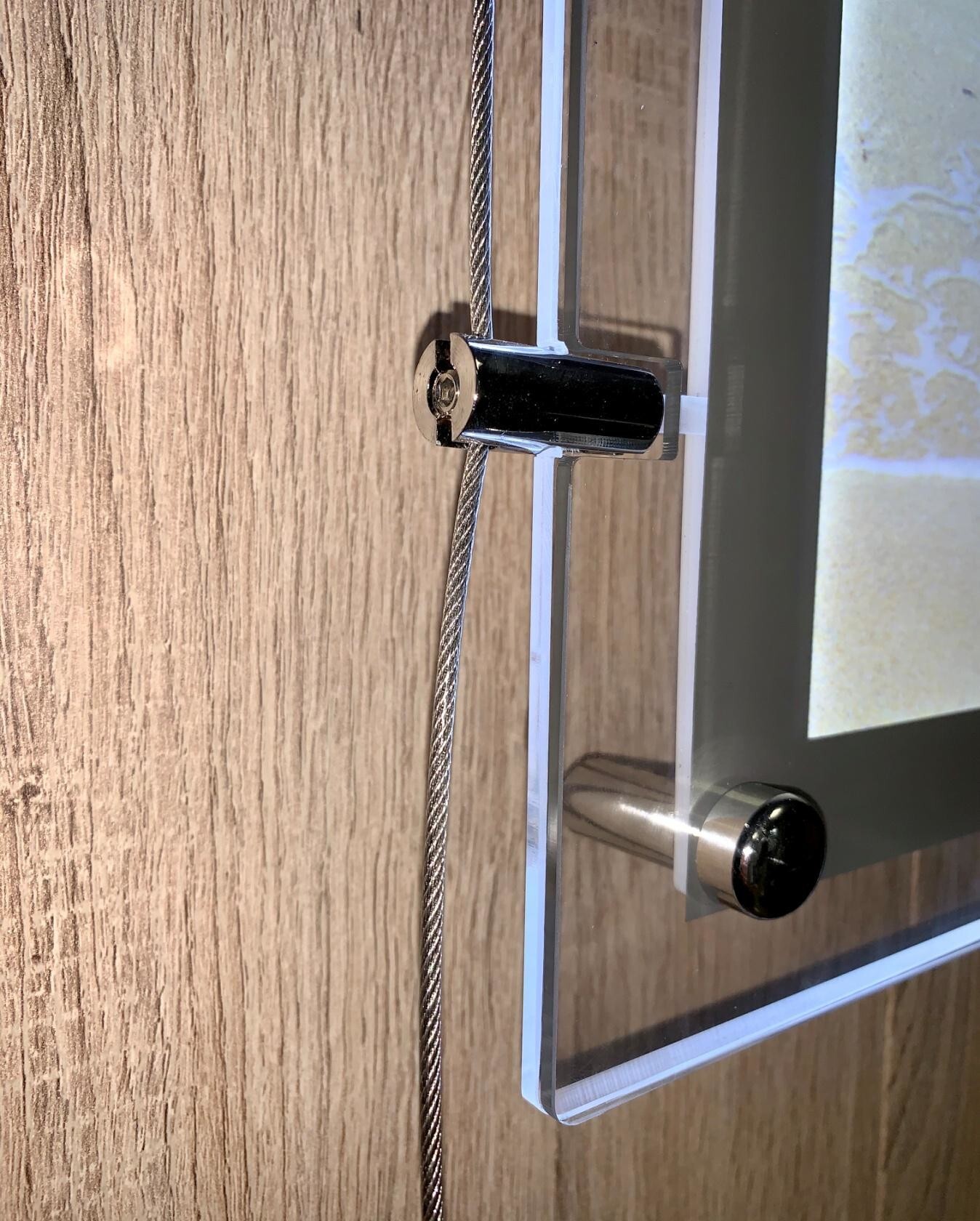 Мы сделали новые дистанционные держатели. Теперь, при замене постера, сама панель будет держаться на стене. За счёт того, что ушки можно отдельно открутить и снять только защитное стекло.