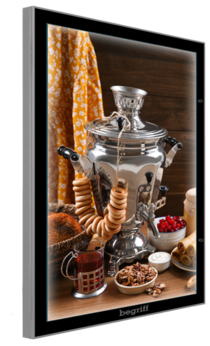 - Для подсветки используется светодиодная линейка. Светодиоды дают белый ровный свет без желтизны и фиолетового оттенка. Такая подсветка не искажает реальные цвета постера. Рекламный материал будет равномерно подсвечен по всему периметру.